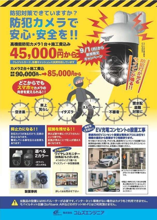 9月1日より期間限定で、高機能防犯カメラ2台+施工費込みのスペシャルキャンペーンを実施します。カメラ2台と工事費込みで